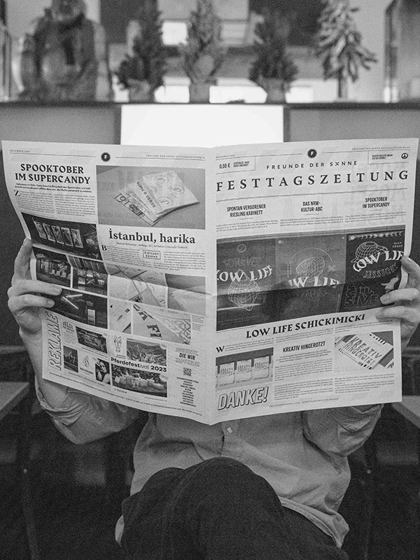 Wir sind die Freunde der Sonne – eure Agentur für visuelle Kommunikation im Belgischen Viertel in Köln. Wir machen Grafik, Branding und Design – von Editorial- und Corporate-Design bis Motion Design und 3D – gedruckt, live und online. Wir entwickeln Konzepte, gestalten Social-Media-Auftritte und realisieren Videoproduktionen. Wir machen euch und euer Unternehmen sichtbar – in Schrift und Satz, in Form und Farbe. Wir denken in Bildern und spielen mit Ideen – und manchmal liegen wir einfach … naja … in der Sonne eben. Schreibt uns, ruft an oder kommt rum. Wir sehen uns.